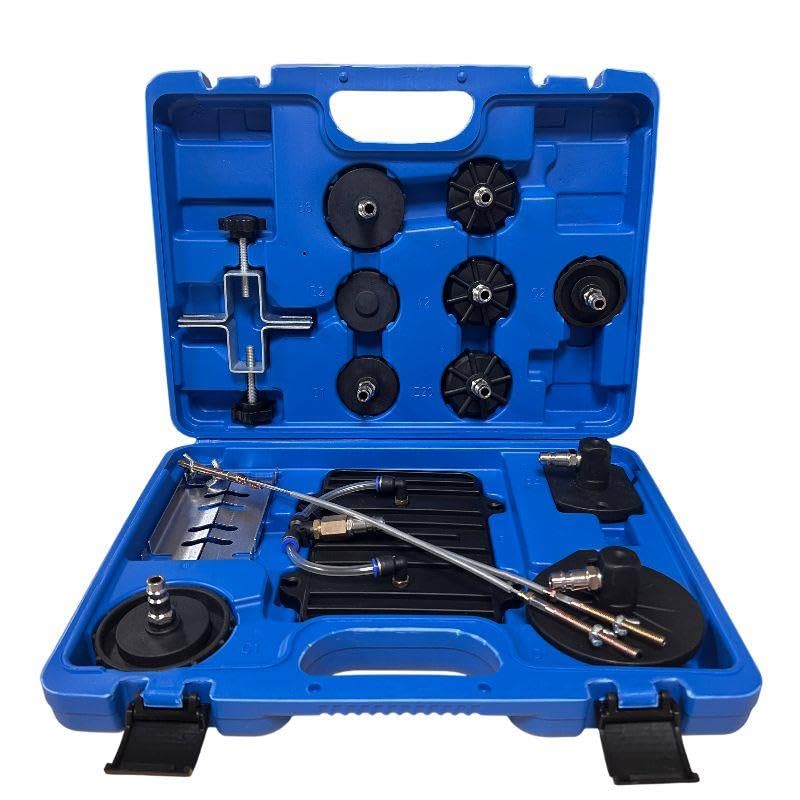 Комплектът е оборудван с накрайници за най-популярните марки автомобили. Течността може да се смени от един човек за няколко минути, без риск от въздух в системата. Необходим е уред с резервоар под налягане, пневматично задвижван, не е включен в комплекта.